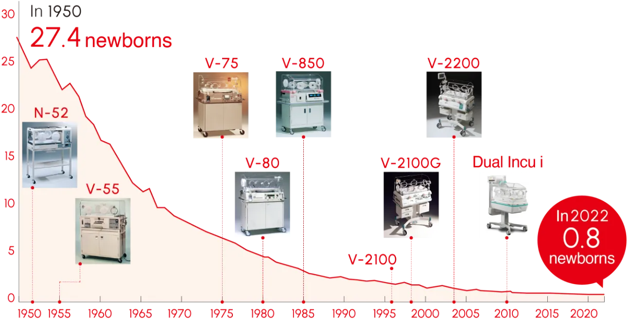 In 1950, the neonatal mortality rate was 27.4 per 1,000 live births. However, thanks to advances in medical care, the rate had dropped to 0.8 by 2022. ATOM MEDICAL CORPORATION's infant incubators have been chosen by customers in Japan, where the neonatal mortality rate is among the lowest in the world.